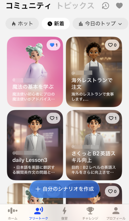 まずは、コミュニティ(ユーザーの投稿)やトピックス(用意されているシナリオ)から選択するか、「自分のシナリオを作成」で作成するか、から。